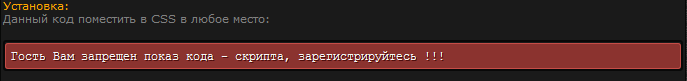 <script>$('.codeMessage').html('$USERNAME$ Вам запрещен показ кода - скрипта, зарегистрируйтесь !!!');</script>